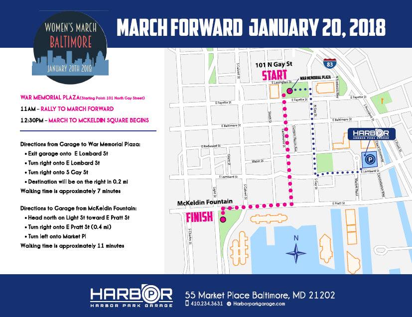 The Baltimore Women’s March is this Saturday January 20, 2018 and here at Harbor Park Garage, we’ve created this event map and schedule to all participants. Feel free to click on the image file to view on your computer or mobile device or download the PDF file below.