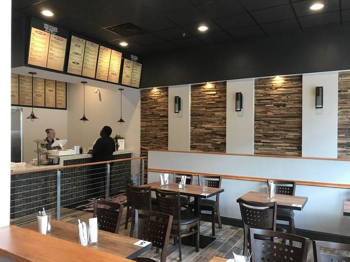 The restaurant is open and airy, with high ceilings and wood-lined walls. Guests order and pick up their food at the counter, often stopping to chat with Rafiq and Mohib, or with one of the other employees.