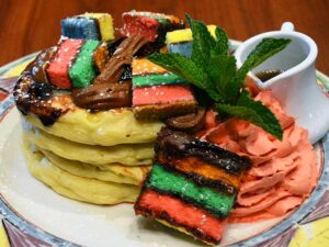 Rainbow Pancakes – with Rainbow Cake Pieces, garnished with Raspberry Jam, Chocolate Icing, Pink Whipped Cream & Rainbow Cake Slice, dusted with Powdered Sugar